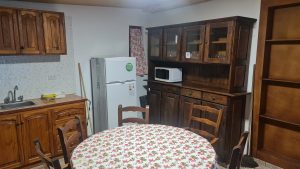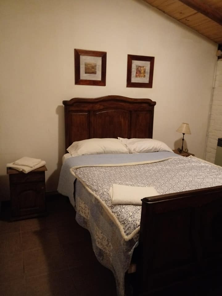 Casa de Piedra Rural, con un dormitorio que tiene una cama matrimonial y una cama simple, living comedor con un sillón cama doble y un futon doble; baño con antebaño y cocina con 4 hornallas y horno. Horno microondas y 1(una) cochera techada